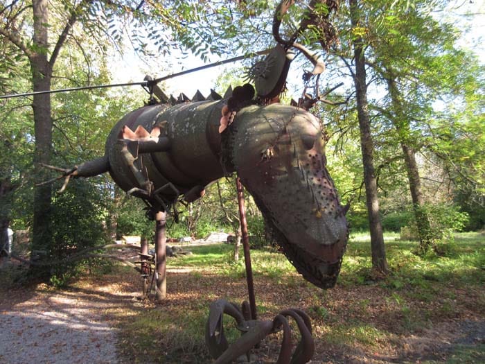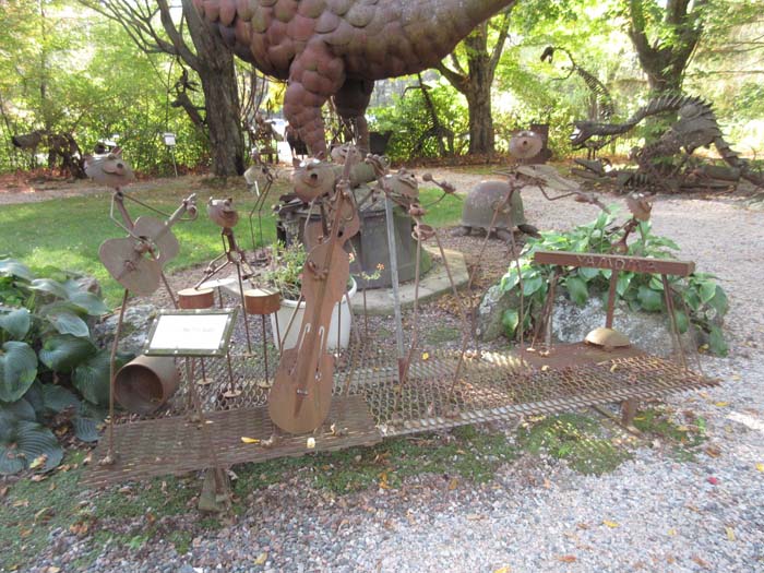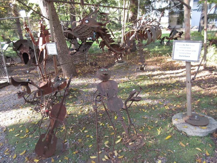 MG3 (Tom Piontkowski, Dave Jefferson, Harry & Cam Hardin, John Walsh & Ruth Bird) and the Healey folks (David & Mary Maul, Fred & Meg Fleischmann, Pat & Pam Douglas, Fred & Penny Thomas) opted to pass on the Madison-area start point in order to caravan from the Milwaukee-area start point in Slinger and drive direct for the meet up in New Lisbon for lunch at the Pine Cove restaurant. Our little caravan was led by president Tom with intermediate stops scheduled for comfort & topping off gas tanks. The afternoon drive saw the constituted whole group visit Jurustic Park, with owner & sculptor Clyde giving a guided tour. All sculptures are fabricated from scrap steel and wear a rusty “patina”: most unusual, including some large dinosaurs that were manually animated.