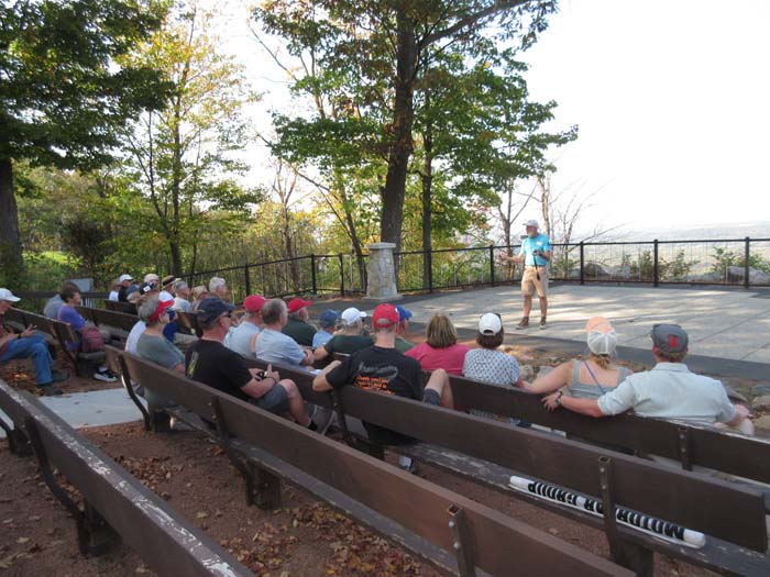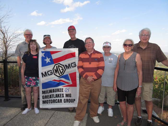Next stop was a short one at Dells of Eau Claire, then the scenic lookout of Rib Mountain, featuring Mark Walker (Fox Brits) giving a talk on the geology of the area as we looked out over the city of Wausau. MG3 members were photographed with the club banner. Pictured are John Walsh, Ruth Bird, Felicia & Bill Hennessy, Shirley Smith (Co-member with Mad Brits), Dave Jefferson, Fred & Meg Fleischmann (Co-members with the Healey club). Harry & Cam Hardin not pictured. After a rest back at the hotel, we again met for dining at Tine & Cellar, a lively place, again pre-ordered, for the farewell dinner. Thanks to the Mad Brits for a tour to be remembered, especially Gene & Judy Davis, Shirley Smith & others… and all else who participated.