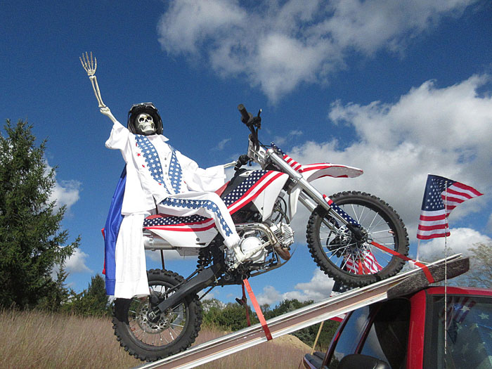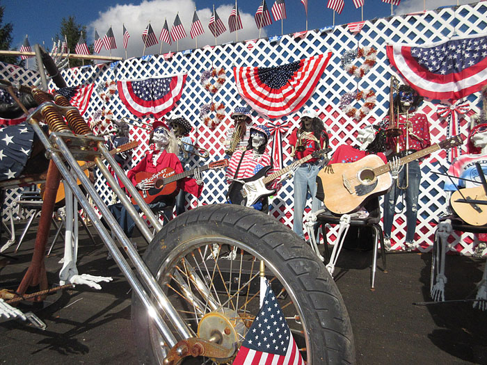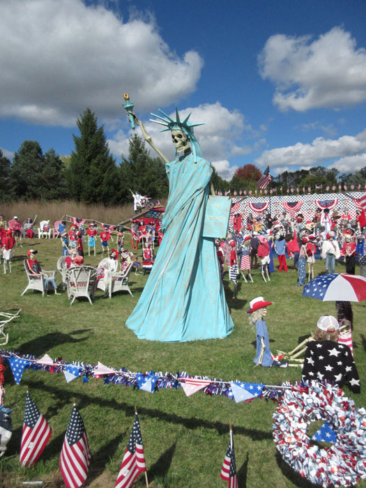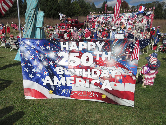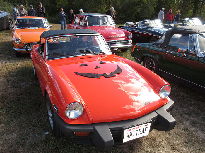 Saturday, 11 October was clear of rain, so therefore a “GO, NO GO” announcement was unnecessary. Those participating had to decide how to meet the cool temperature and whether to motor with hood up or down. When the temperature rose somewhat, many opted to stay with the hood up. The large group departed Sawmill a bit after 10:00, and soon passed the annual Skeleton Display on the north side of Holy Hill Rd just before the turn onto Hwy CC. This year’s theme was the red, white, & blue 250th year birthday party of the founding of the country. The conga line stayed together until a car stalled on the first leg and split the parade; another member got out of his MG and assisted to help restart the stalled car…well, that’s what clubs are all about! The delayed group rejoined the lead group at the Pine Hill Orchard stand for the scheduled 1/2 hour break before beginning the 2nd leg.