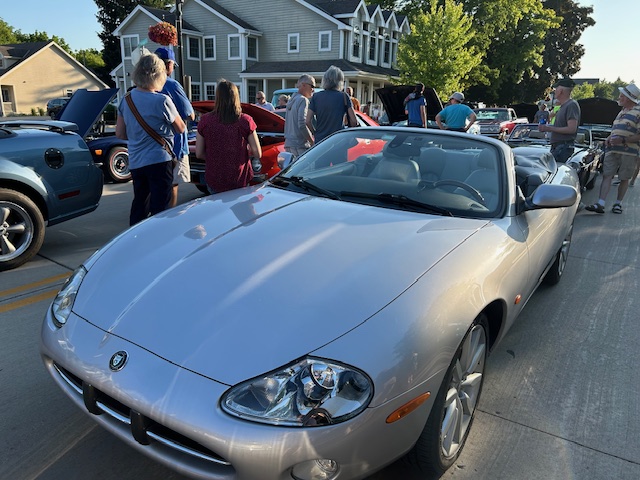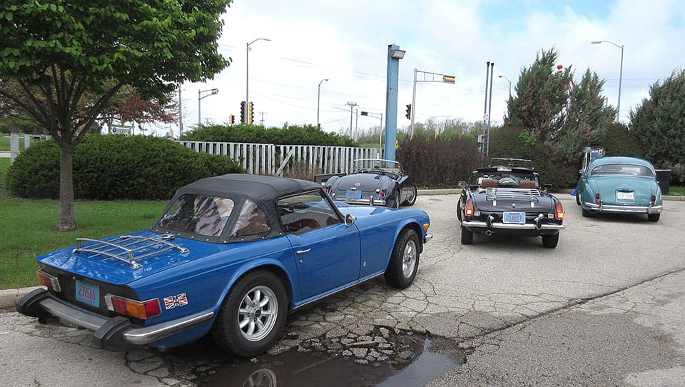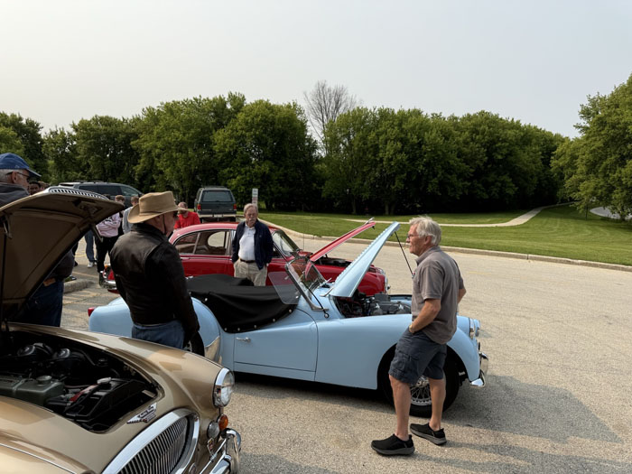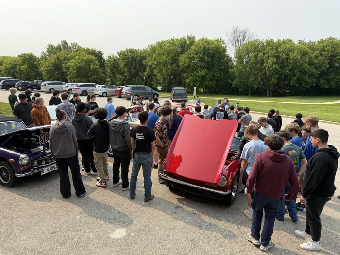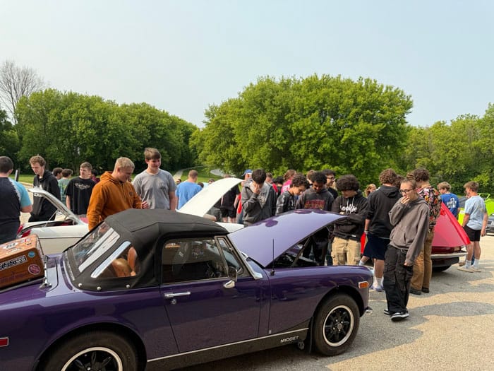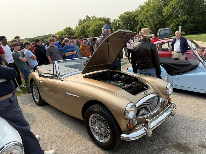 Dave Jefferson (MGB) & Jim Morris (TR6) each drove 40 miles Monday, 2 June, joining 4 other owners to display their cars to automotive shop class students at Waukesha West HS. The coordinator of this event was Pat Douglas, representing British Car Field Day volunteers. The purpose was 2-fold: to promote our British cars and for the BCFD organization to donate $250 to the shop class. The students heard owners speak briefly about their cars & the hobby, then asked questions, looked the cars over closely, some sitting in cars to get a few minutes of “cockpit time”. Other cars displayed were an MG Midget, Austin-Healey 3000, Triumph TR3, and a ’65 Jaguar Mk II. It was a positive experience for all involved.