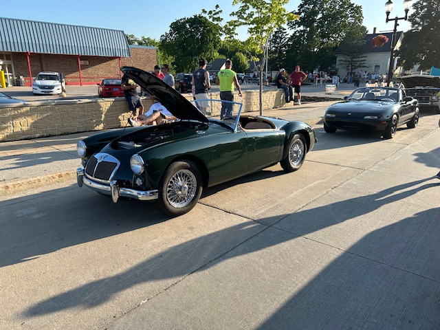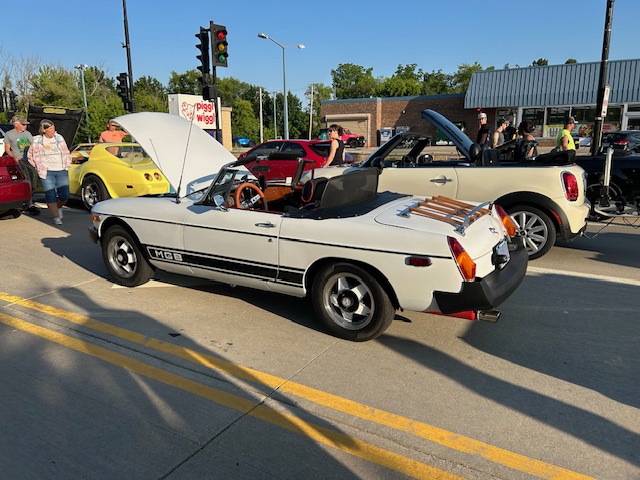 MG3ers gathered at a busy Leduc’s Frozen Custard at 6:00 pm on a pleasant evening with 9 people, 4 MGs and a couple of modern cars. Interestingly 5 participants joined the club in 2025, with 3 at their 1st event. We had good discussions around one large table. Of note was a white MG TD parked in the lot, but we never spoke to them as they drove off. Also, Harry & Cam arrived in their car, followed by John Baas in not only the same year MGB but with the same burgundy color! Kevin drove his recently acquired MG Midget advertised in the club’s “Cars for Sale” listing. Dave Jefferson drove from Mequon 105 miles round trip just for a brat: didn’t arrive home until 9:30 PM. Thanks to all for showing up.