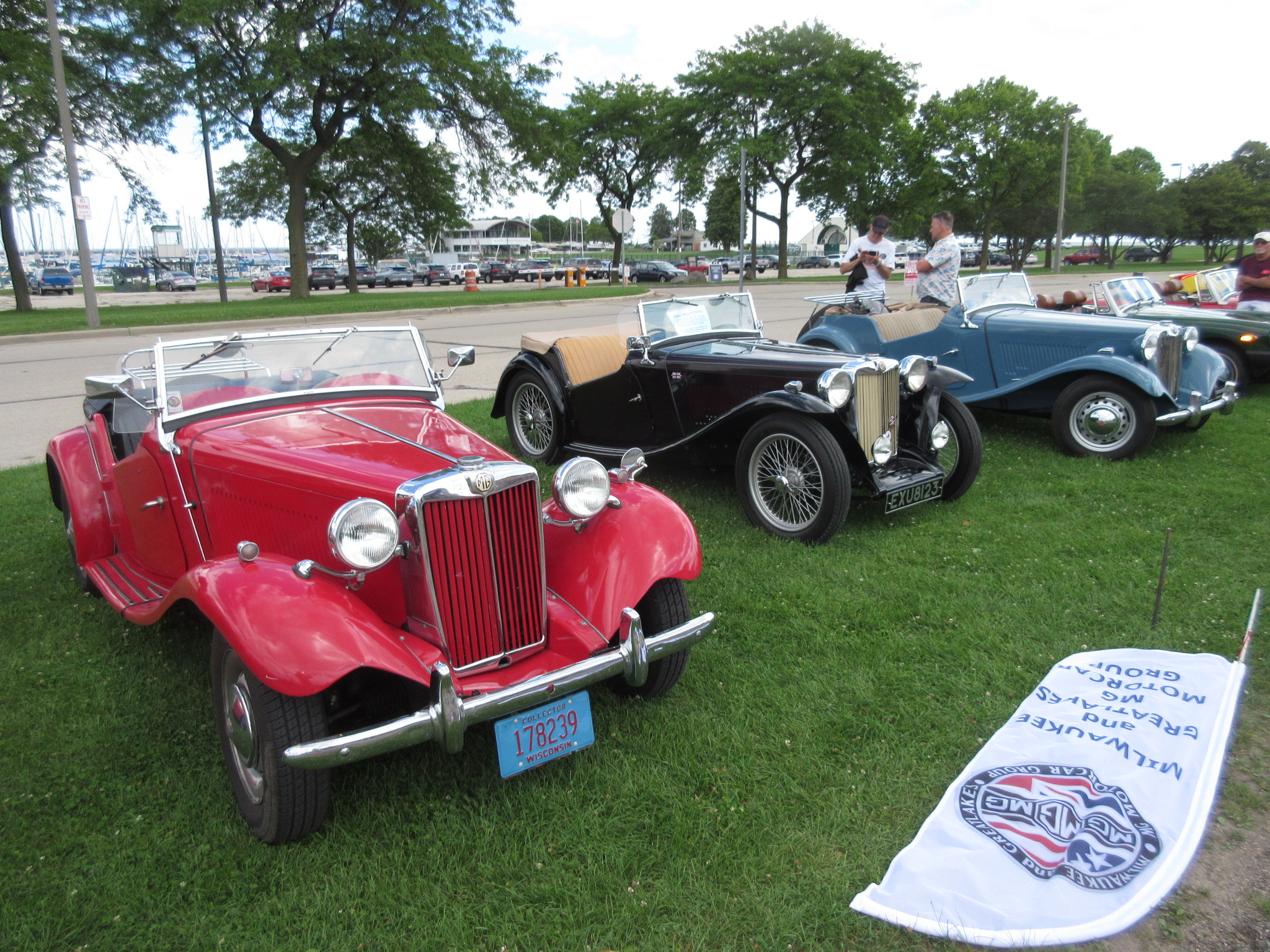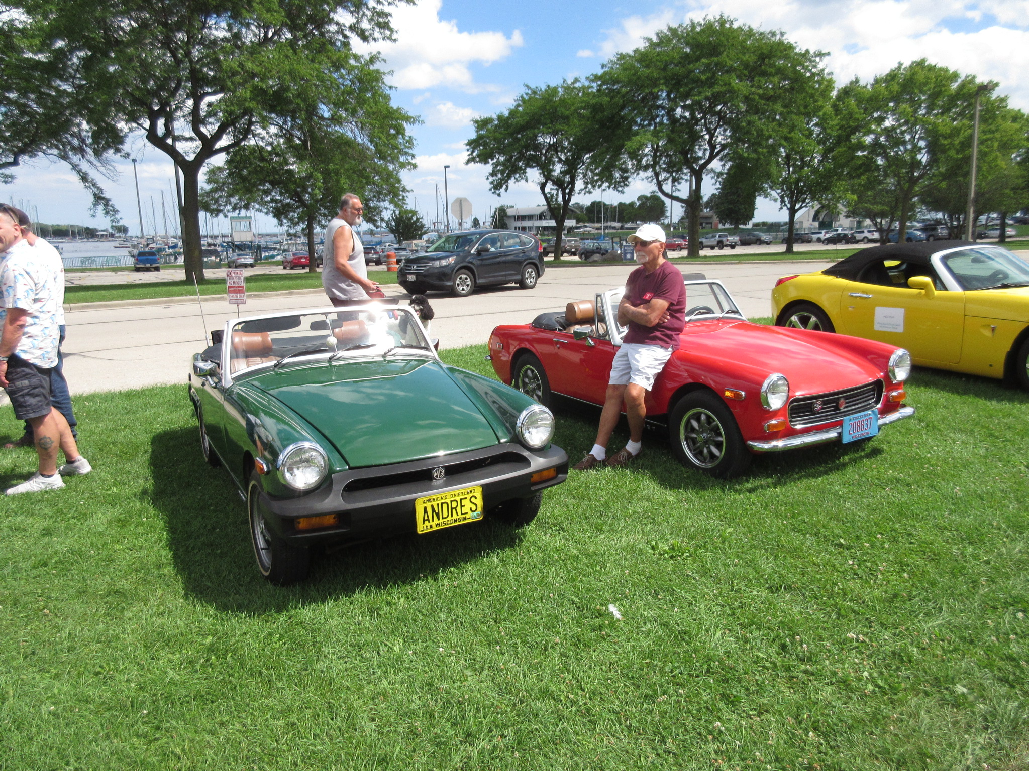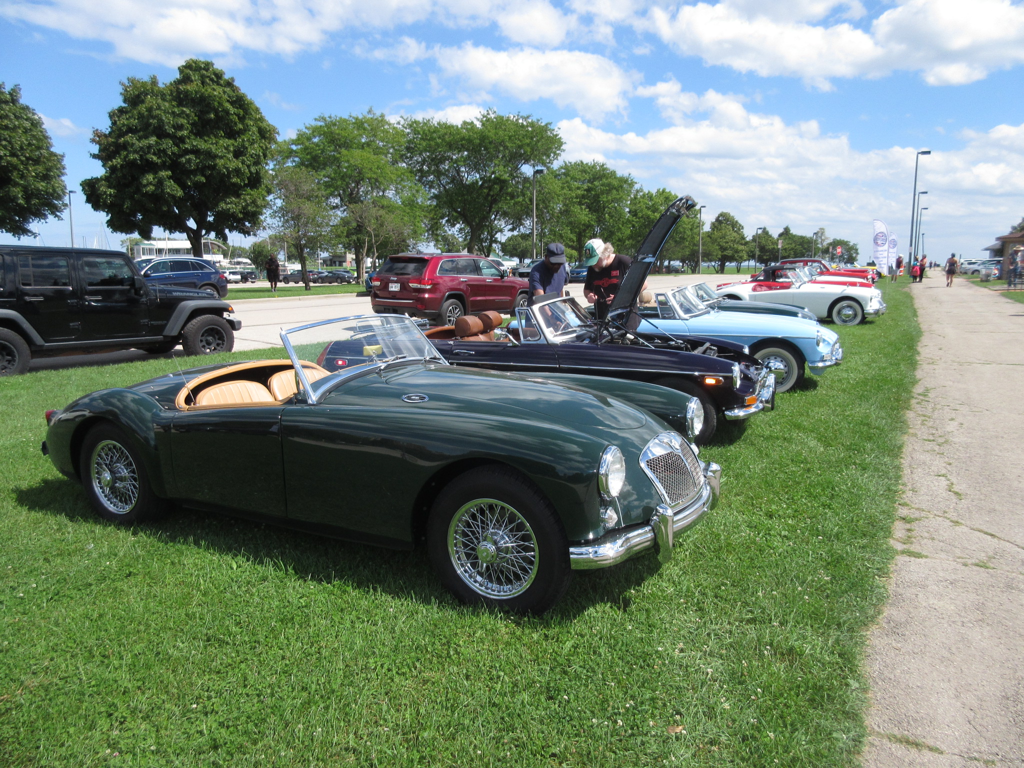 MG3 staged its annual Lakefront Club Car Show on the rain date Saturday 23 August, 2025. Participants arrived to park on the grass strip in front of the Gift of Wings kite store on Lagoon Dr. We avoided the high heat & humidity of the preceding Saturday with no rain in the forecast, partly sunny skies, cooler temps, and much less humidity. However, high winds were more than the pop-up canopy could take, so the cover was taken down; umbrella tables provided shade as members claimed their complimentary ice cream and enjoyed the fair weather. There was a “T-section”, a TC and 2 TDs parked together as the oldest MGs on the site. Interestingly were the 2 new members joining the club, and 2 other members paying for their new grille badges. Many visitors stopped by to examine the cars and ask the owners questions. Thanks to all who showed their cars, including some Triumphs. Not everyone signed the participation sheet, so the list misses some who were there.